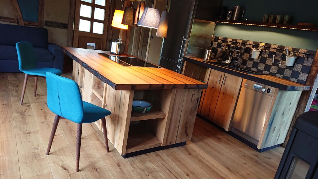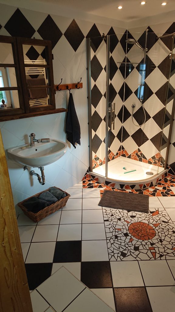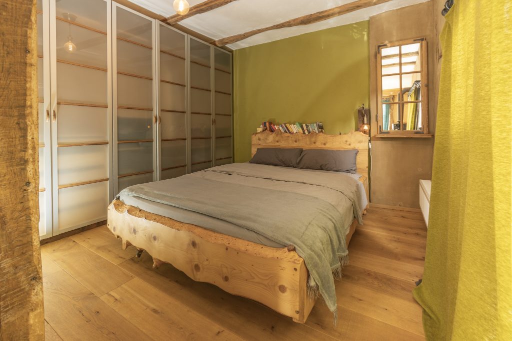Das Appartment wurde von uns konsequent baubiologisch renoviert. Der gesamte Wohnbereich wurde mit Lehmfachwerk ausgemauert, mit Lehm verputzt und mit Lehmfarbe gestrichen. Der Fußboden ist mit biologisch gewachsten Eichendielen belegt, die Möbel inkl. Küche haben wir selbst aus heimischem Holz gezimmert und ebenfalls biologisch gewachst.